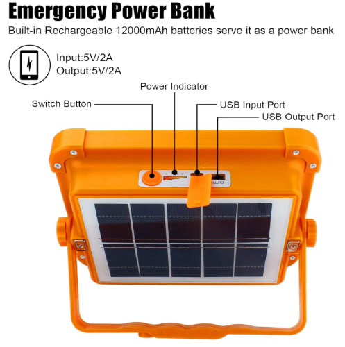 - 🔥【 Rechargeable Battery】This LED battery work light with 12000mAh rechargeable battery can be charged by USB cable or solar panel. When fully charged, the work light can last about 20 hours in medium brightness (last 6H-8H in high brightness).